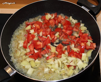 paradicsomot és a paprikát kis kockára vágjuk, majd a hagymához