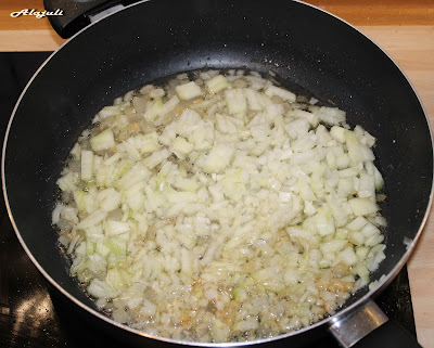 vöröshagymát szintén apróra vágjuk, a szalonnához adjuk, majd