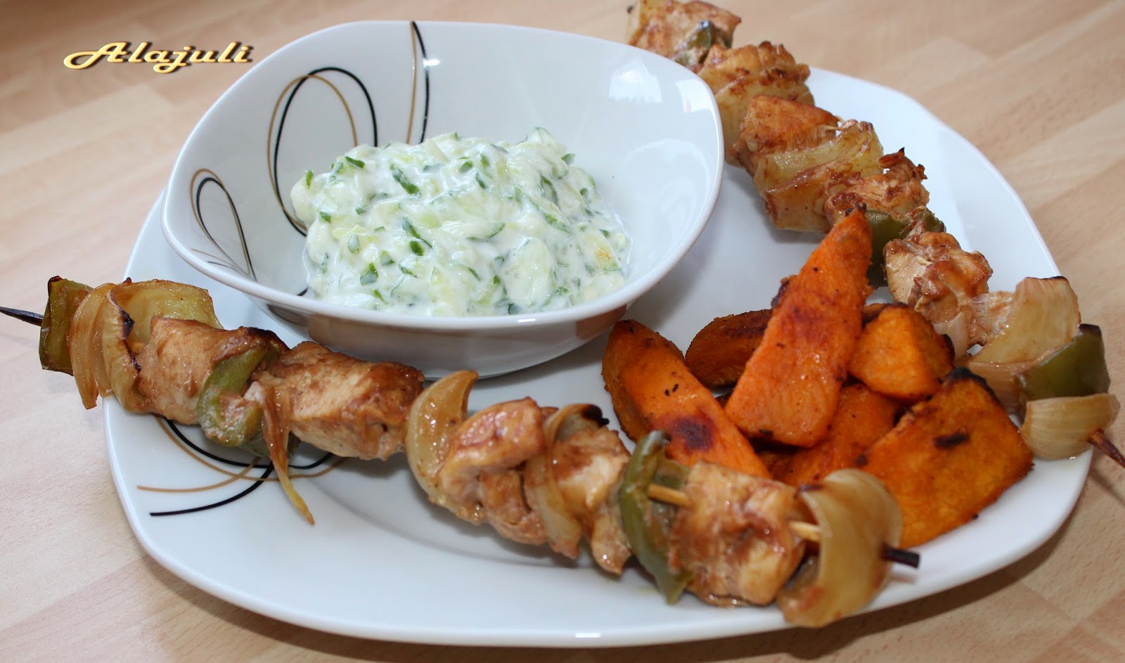 Sült édes burgonyával és tzatzikivel tálaltam, de bármilyen