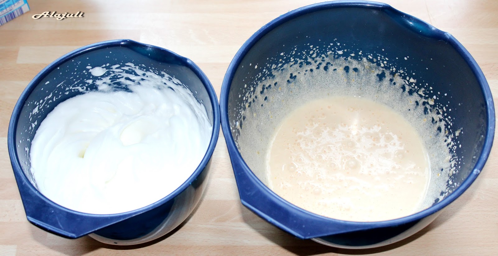 szétválasztjuk a tojásokat. A fehérjéből egy csipet só hozzáadásával kemény