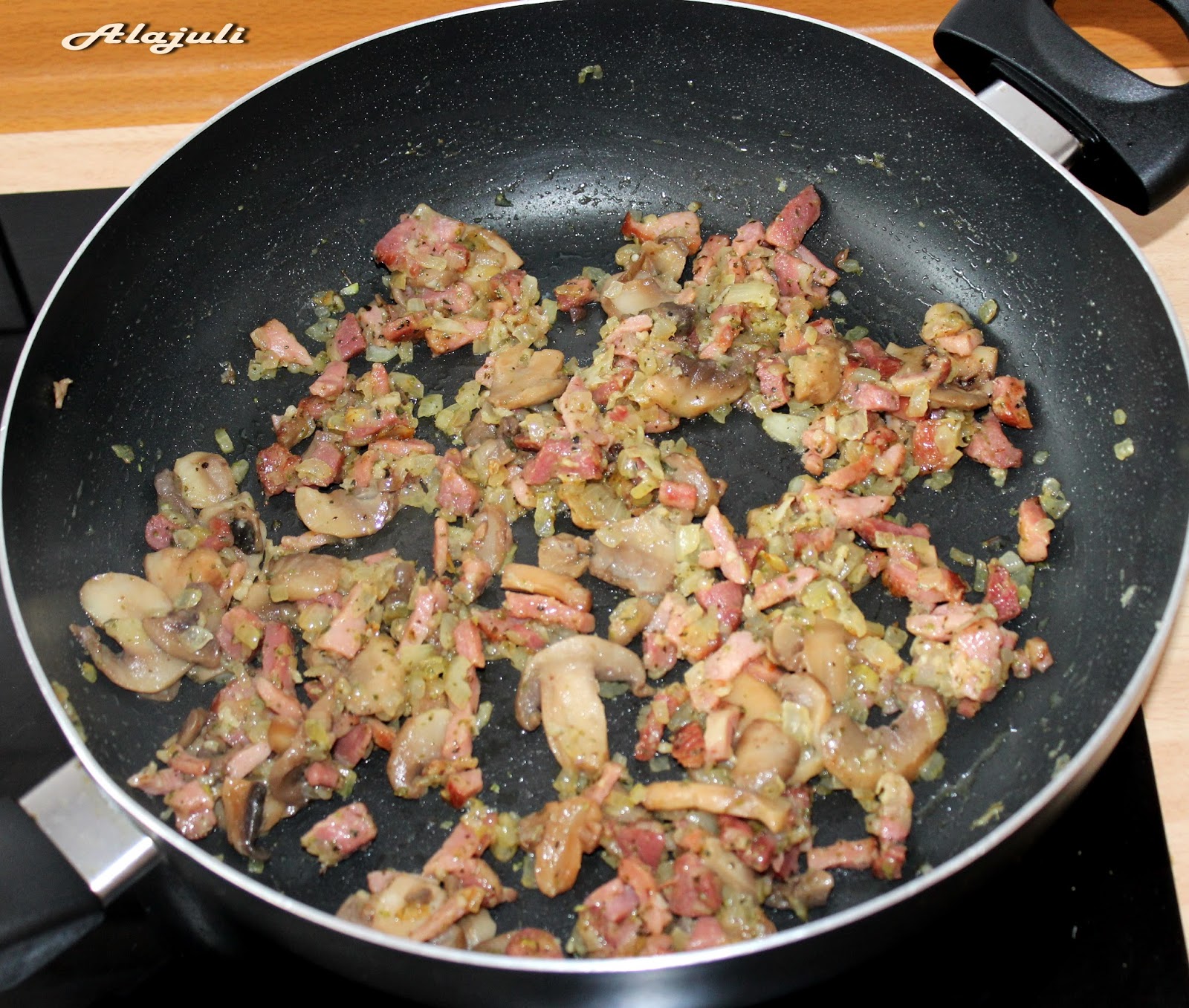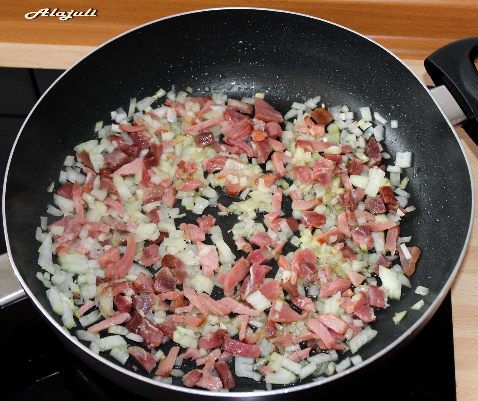 megpirítjuk a kis kockára vágott sonkát, a vöröshagymát és a zúzott fokhagymát.