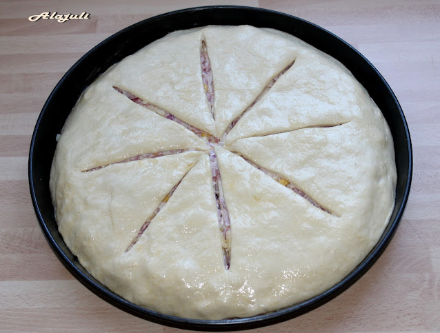 formába helyezzük, megkenjük olvasztott vajjal és elsimítjuk rajta a töltelék
