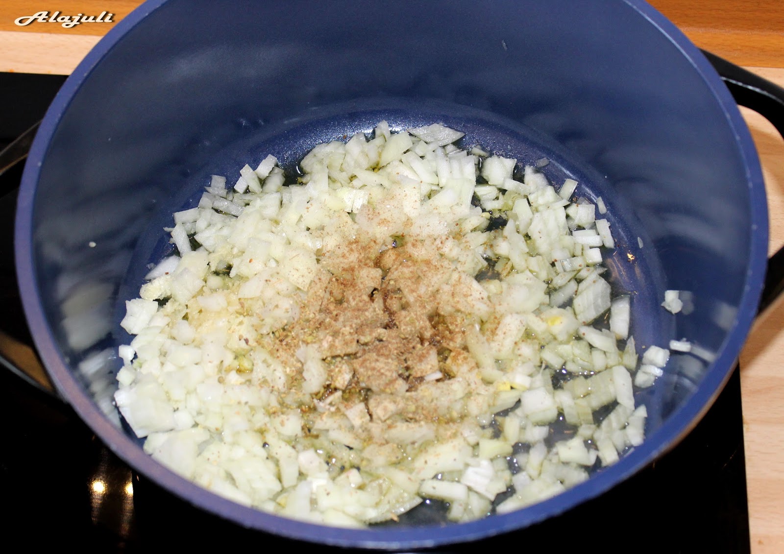 vágott vöröshagymát és a reszelt fokhagymát megdinszteljük az olíva olajon.