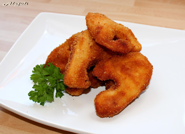 A szokásos módon (liszt-tojás-zsemlemorzsa) bepanírozzuk és