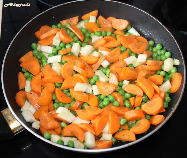 majd megpirítjuk rajta a darabolt zöldségeket és a borsót, pici