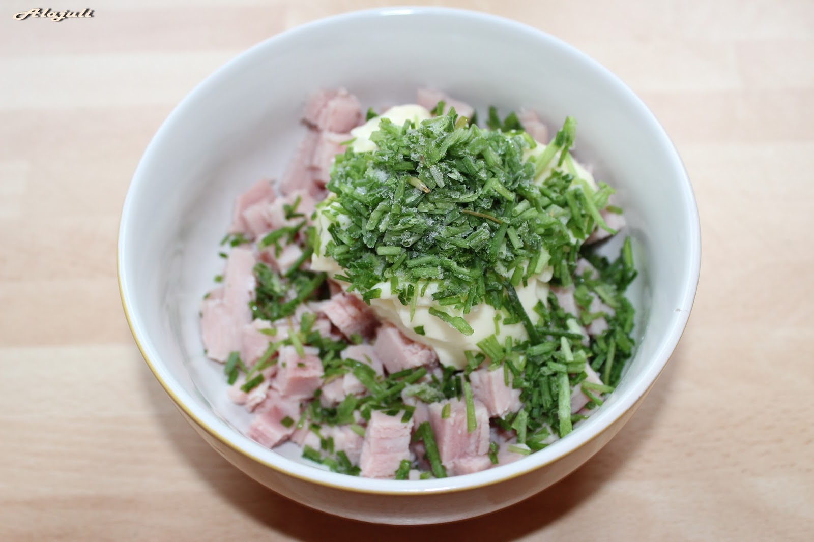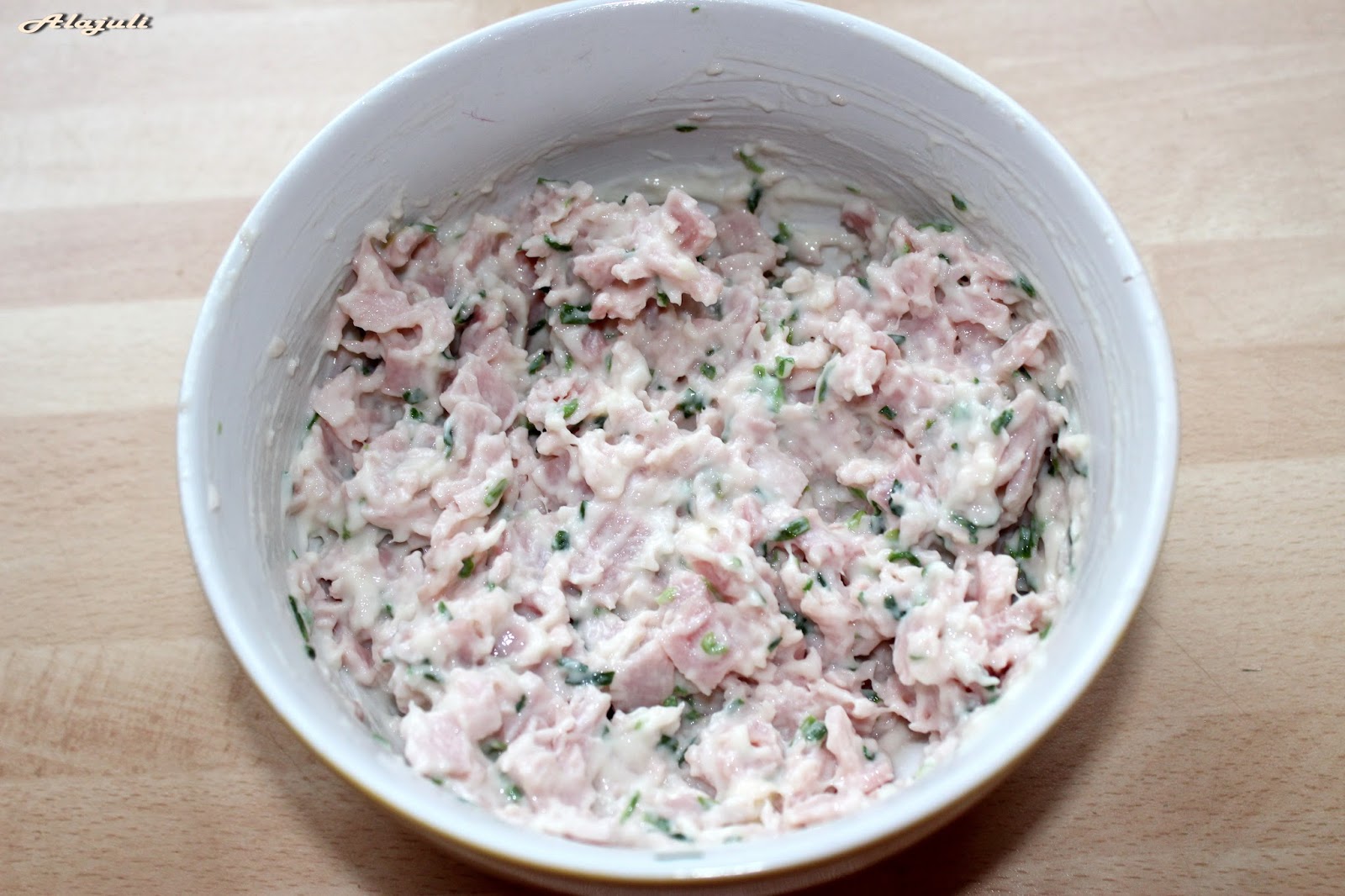 apróra vágott sonkát és snidlinget összekeverjük a krémsajttal.