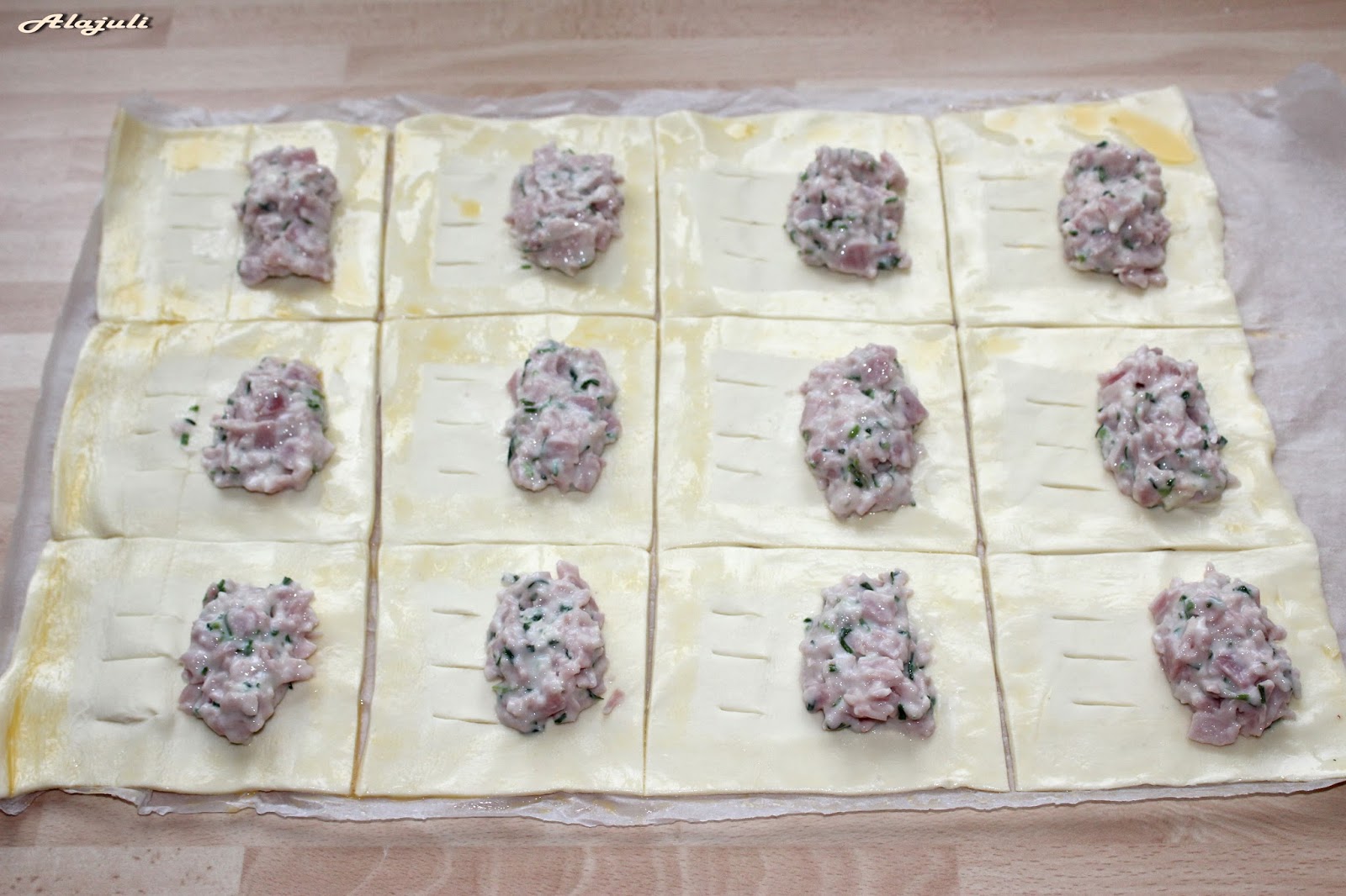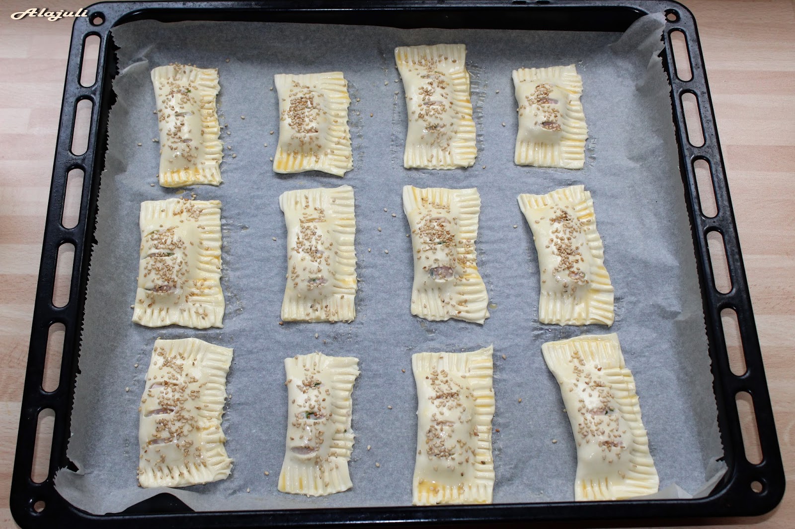 töltött leveles tésztákat sütőpapírral bélelt tepsibe
