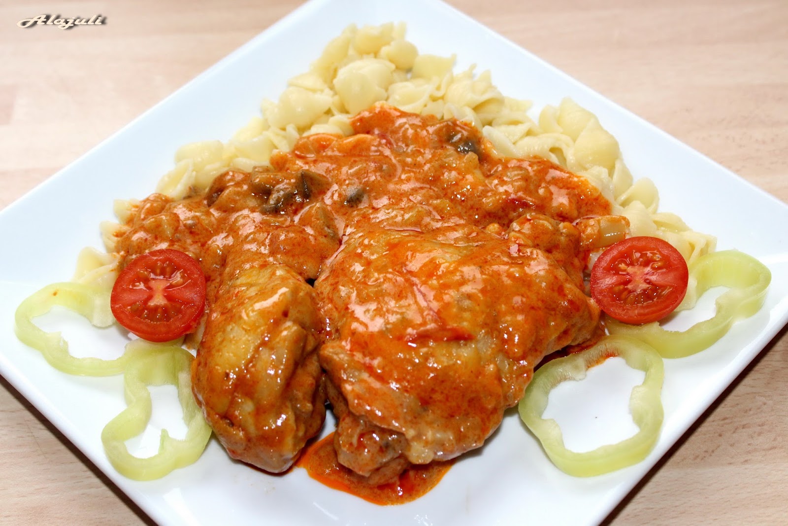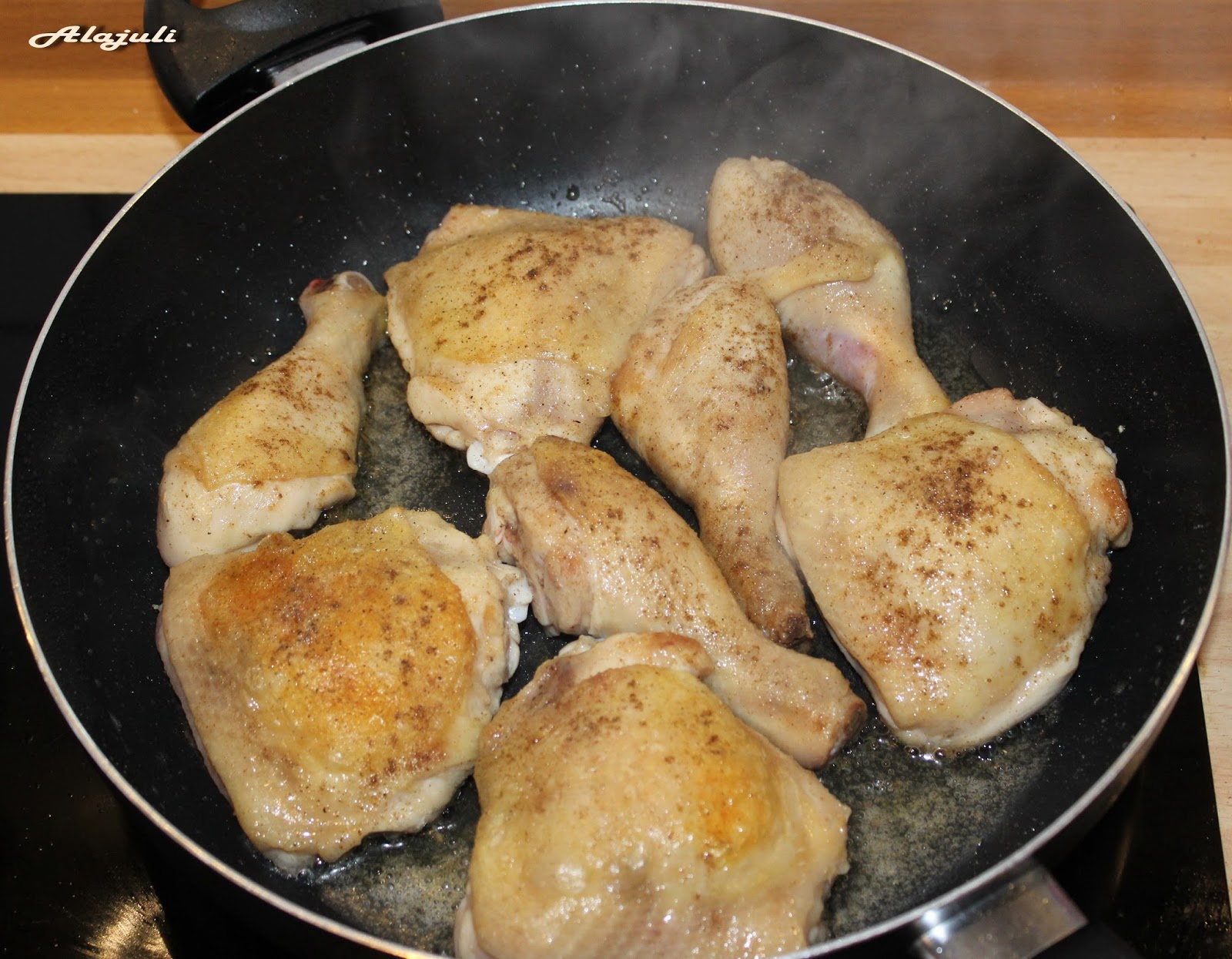 vízzel, belehelyezzük az elősütött csirkecombokat, majd az
