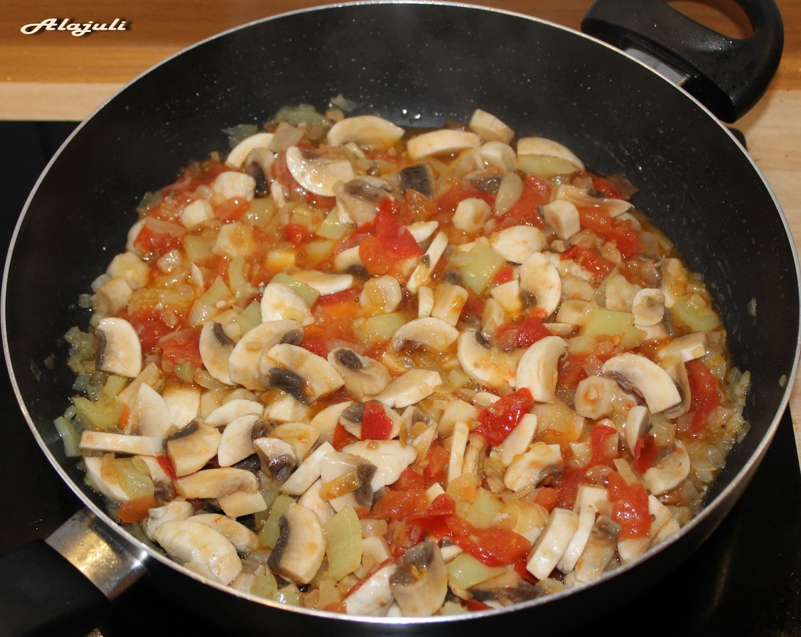 gombát megtisztítjuk, majd szeletekre vágjuk. A lecsós alaphoz
