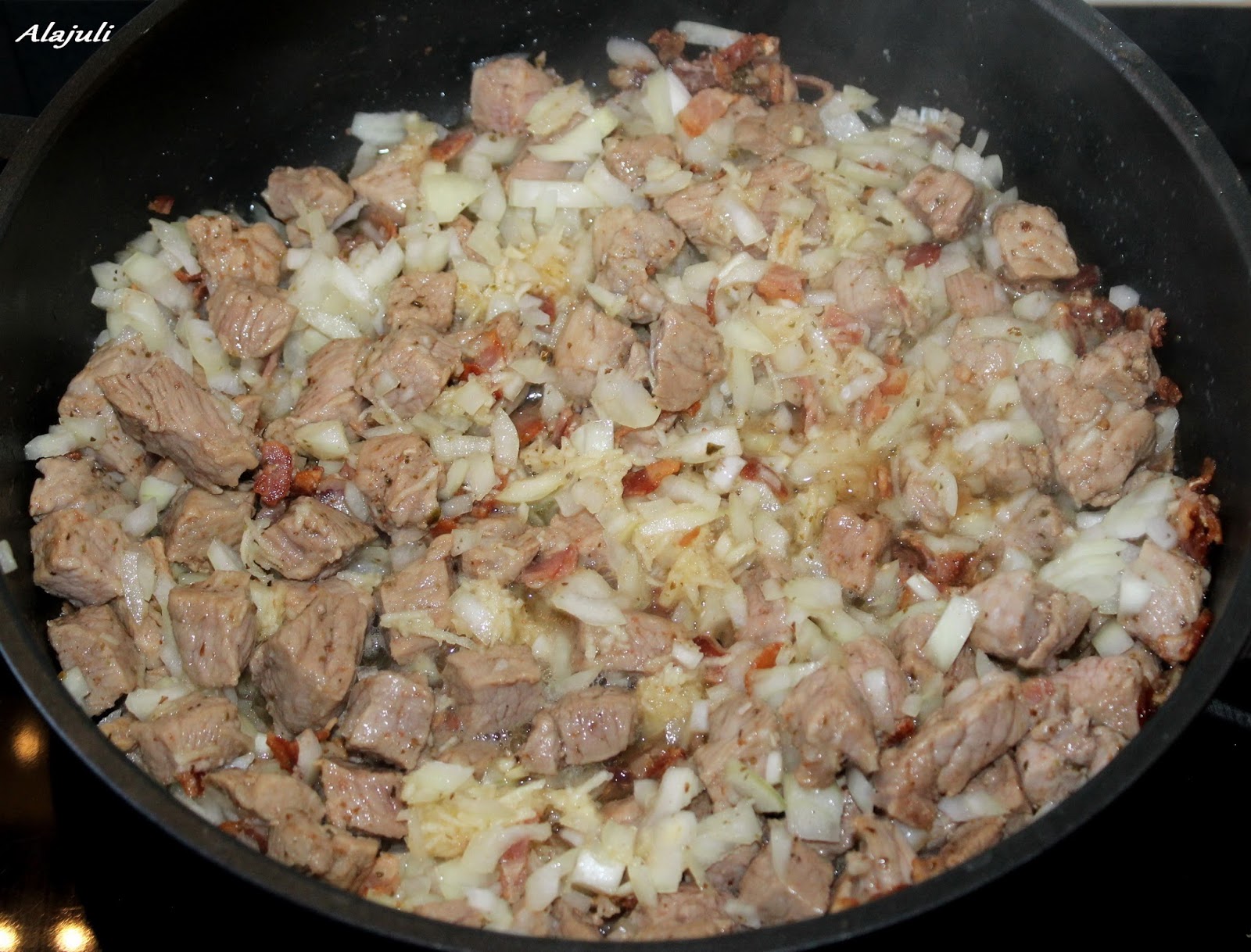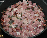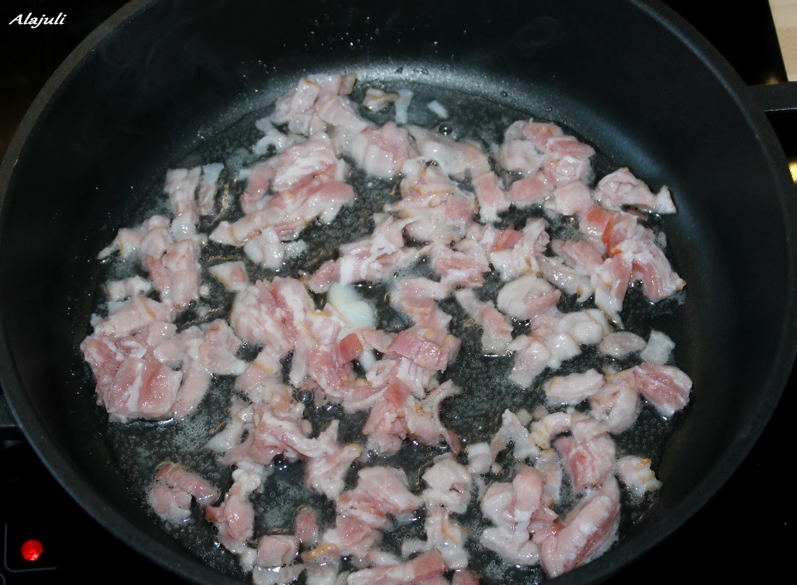 apróra vágott bacont elkezdjük sütni a zsíron. Én általában