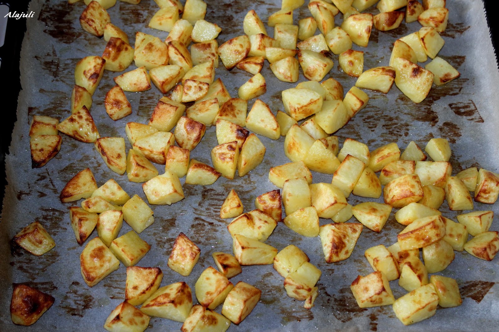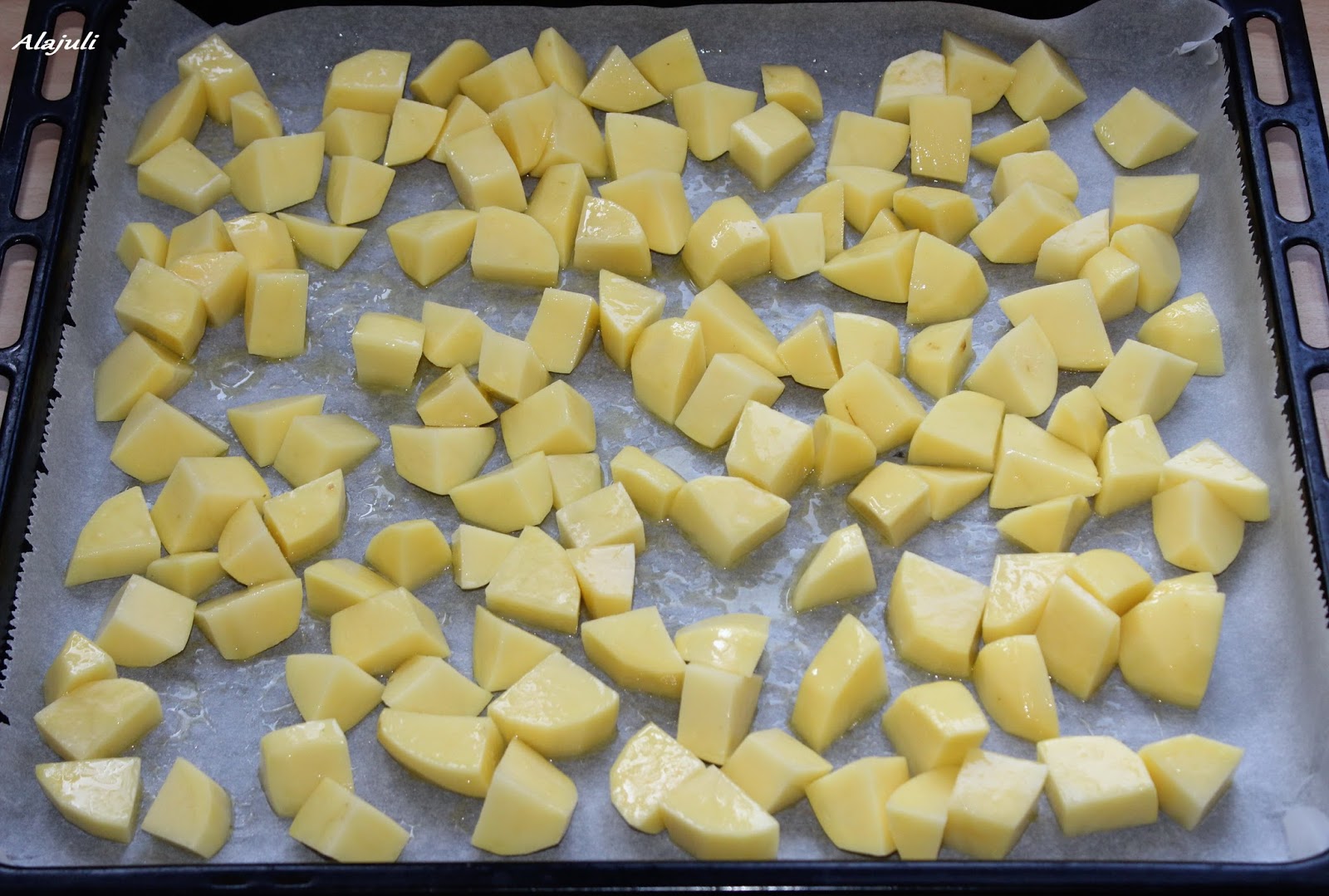 burgonyát kockára vágjuk, megsózzuk, majd meglocsoljuk olajjal.