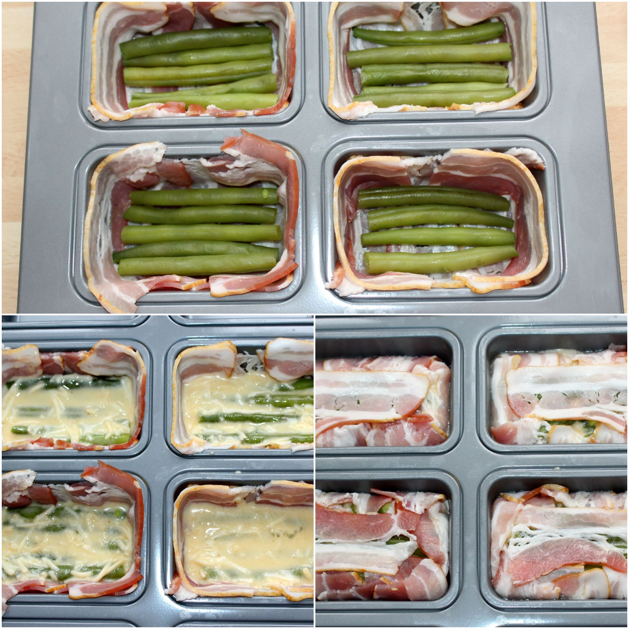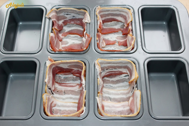 Egy sütőformát kibélelünk baconnel. Egy-egy kis darabkát hagyjunk meg a tetejére! Nálam a formák mérete 10 x 6 cm és 4 cm magas. Akinek nincs ilyen kicsi sütőformája, nyugodtan készítheti őzgerinc formában, magasabb falú kis tepsiben, de akár egy kisebb jénaiban is. Én azért készítettem ilyen kis formákban, mert egy hidegtálra készült és így jobban mutatott. 🙂
