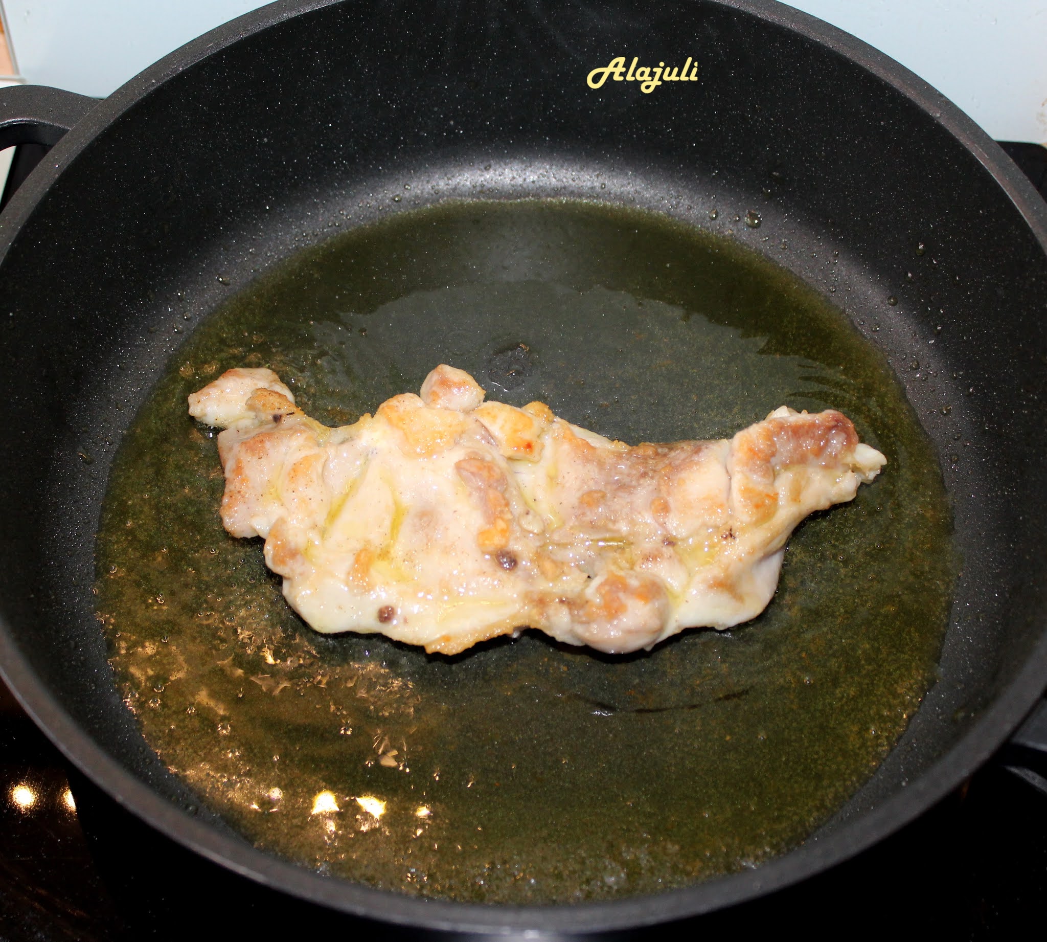 Egy edényben olajat hevítünk, majd a hús mindkét oldalát megpirítjuk.