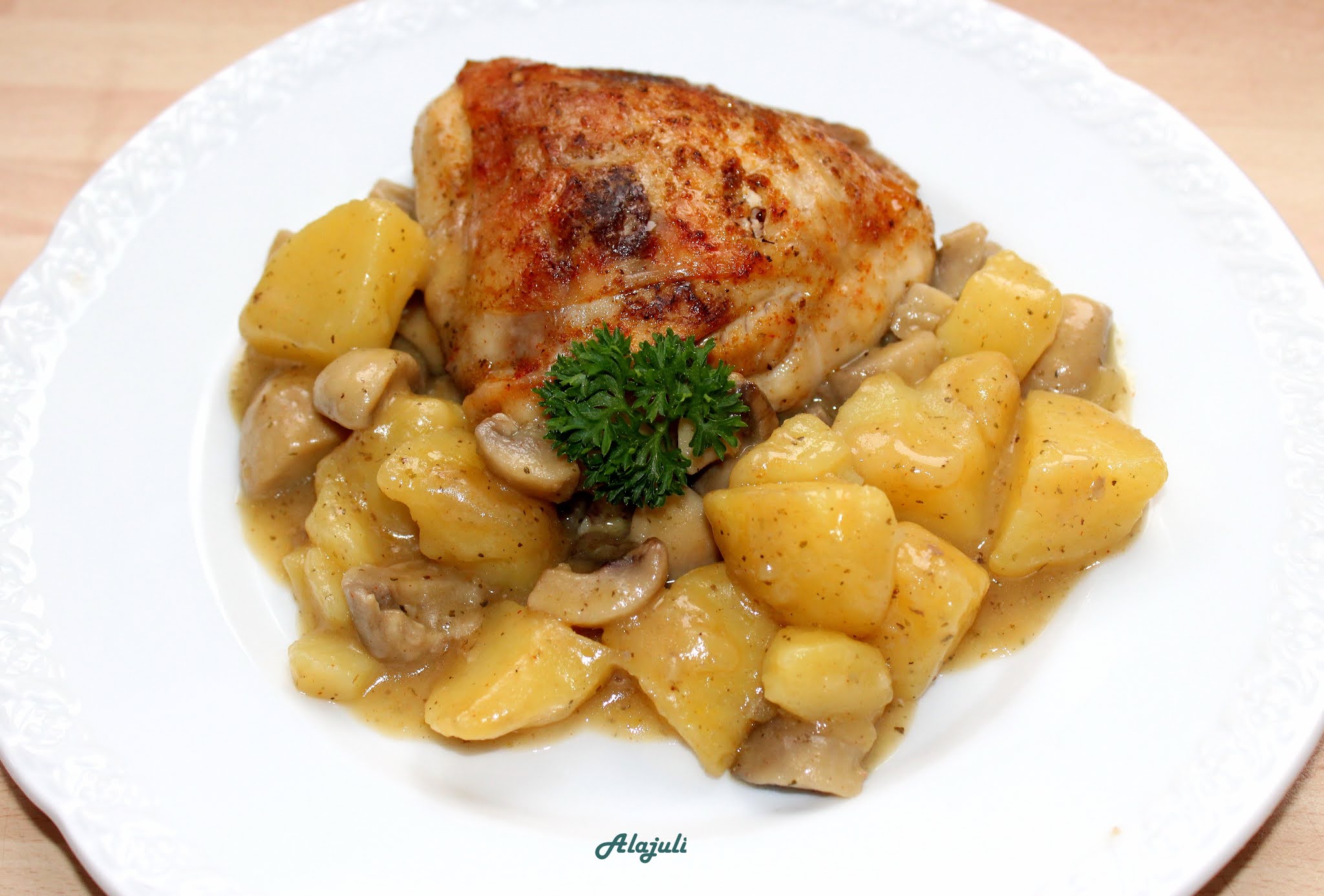 | Tejszínes-gombás burgonyán sült csirkecomb |