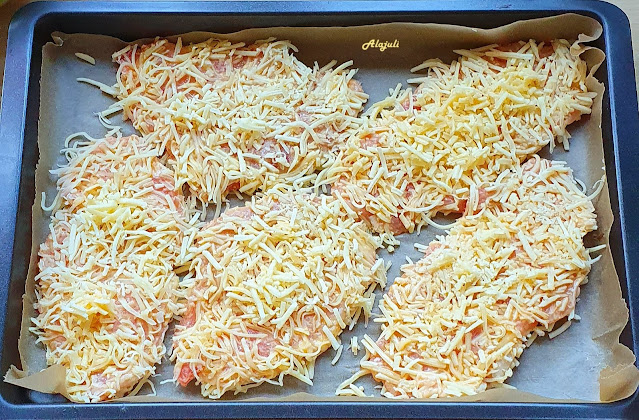 Egy tepsit kibélelünk sütőpapírral, majd bele fektetjük a hús szeleteket.