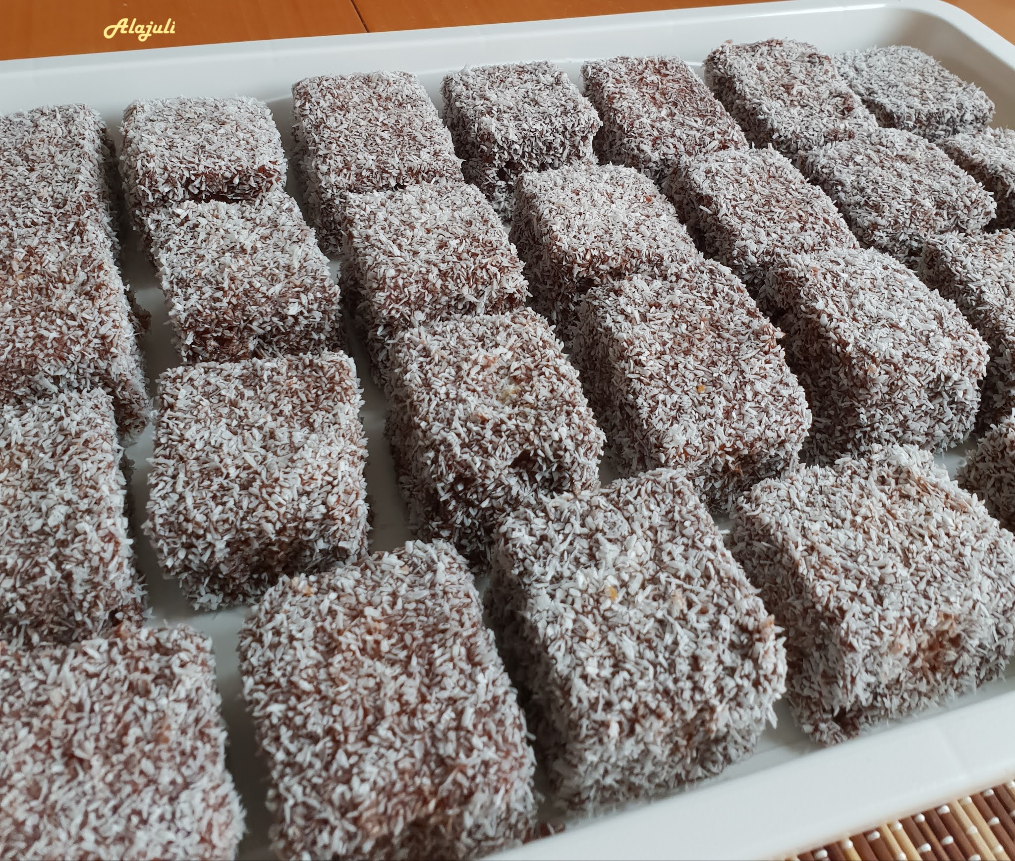Az elkészült, nagyjából kihűlt piskótát téglalap alakú darabokra vágjuk. Először megforgatjuk a csoki mázban, aztán a kókuszreszelékben.