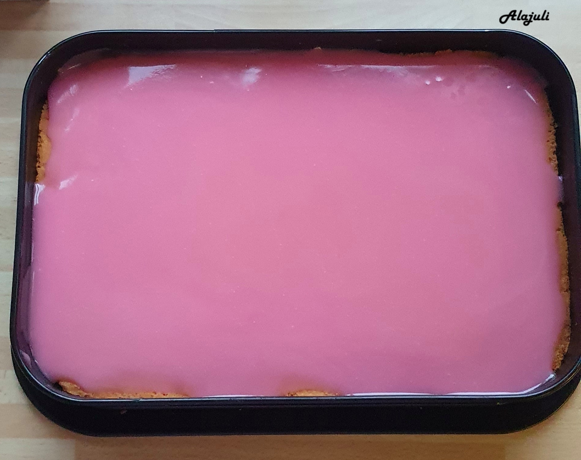 A mázat a süti tetejére öntjük. Ne használjunk spatulát, vagy kanalat az elkenéshez! Inkább a tepsit mozgatva egyengessük el a mázat, mert így szebb lesz a felülete.