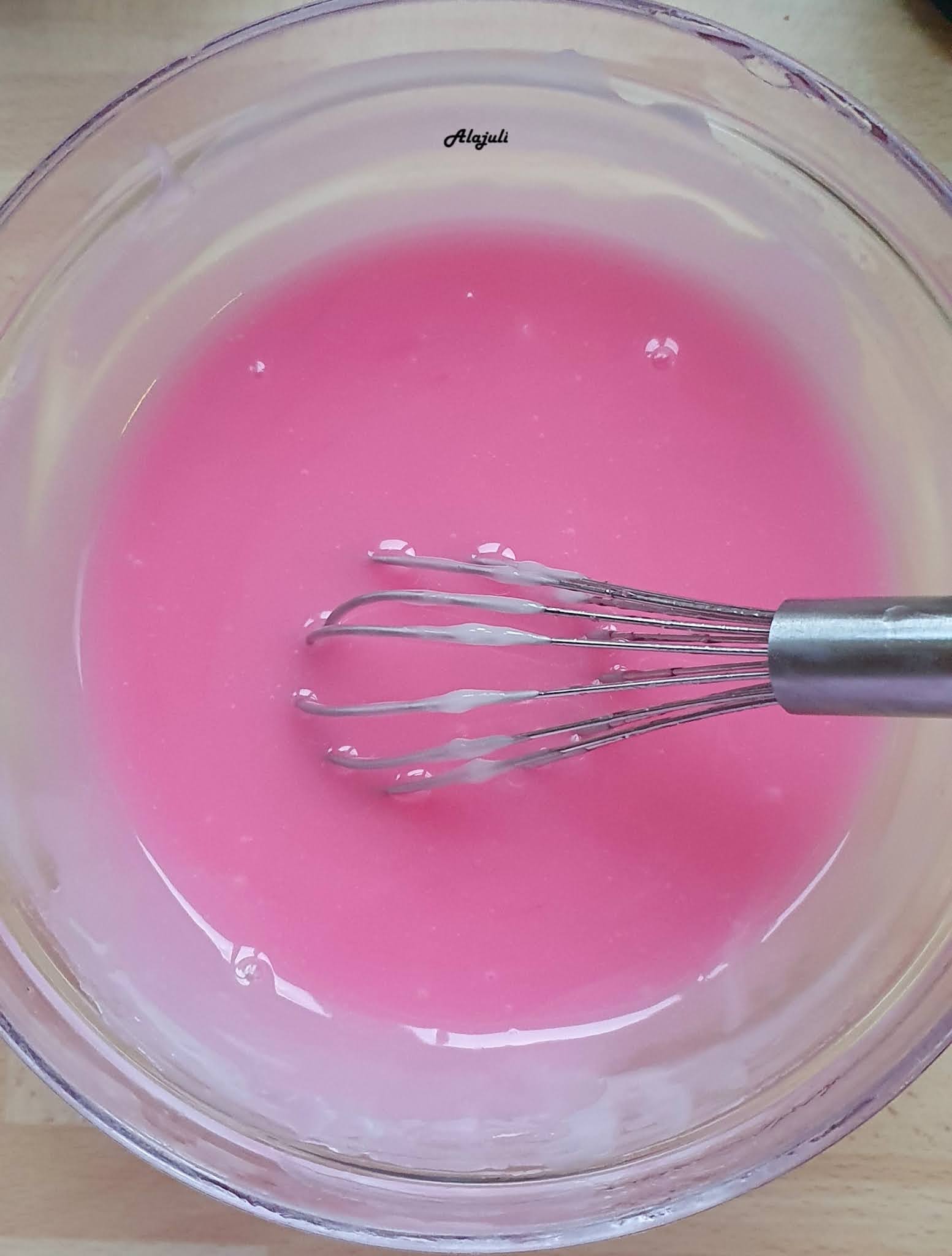 Harmadszorra pedig, a tetejére való rózsaszín máz nem akart megkötni. (Nyilván nem, mivel elsőre kevés ideig forraltam, de aztán tökéletes lett. 😁)