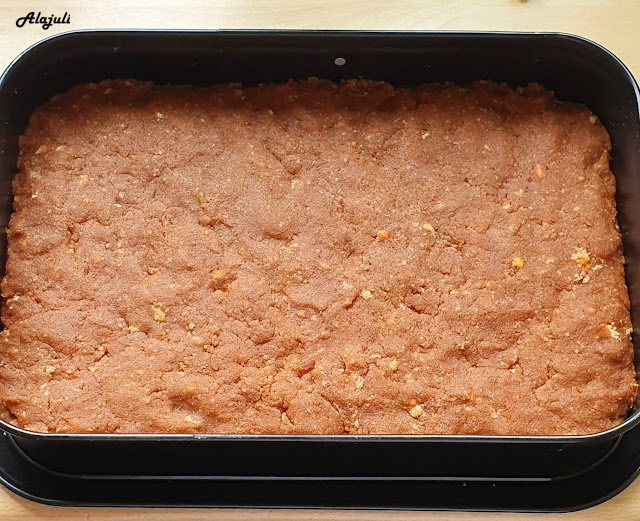 Az egyik lapot a tepsibe tesszük, majd megkenjük baracklekvárral.