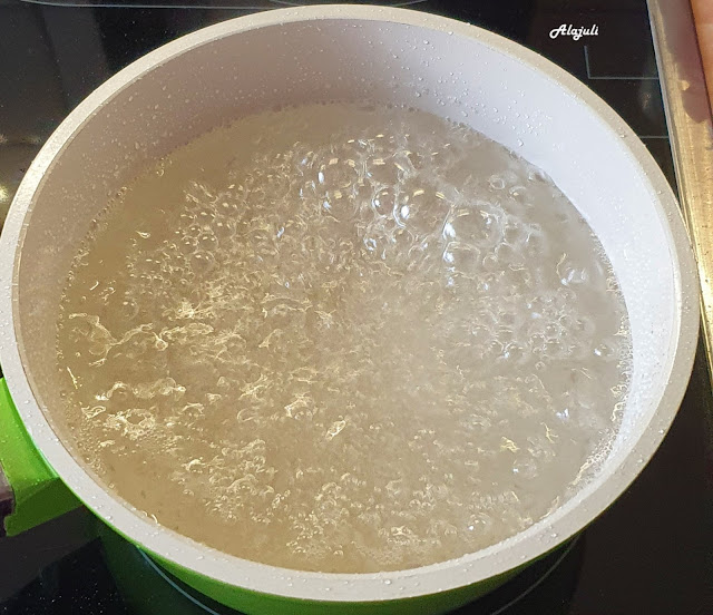 A mázhoz egy edényben felforraljuk a hozzávalókat, majd 20-25 percig alacsony lángon gyöngyözve forraljuk.