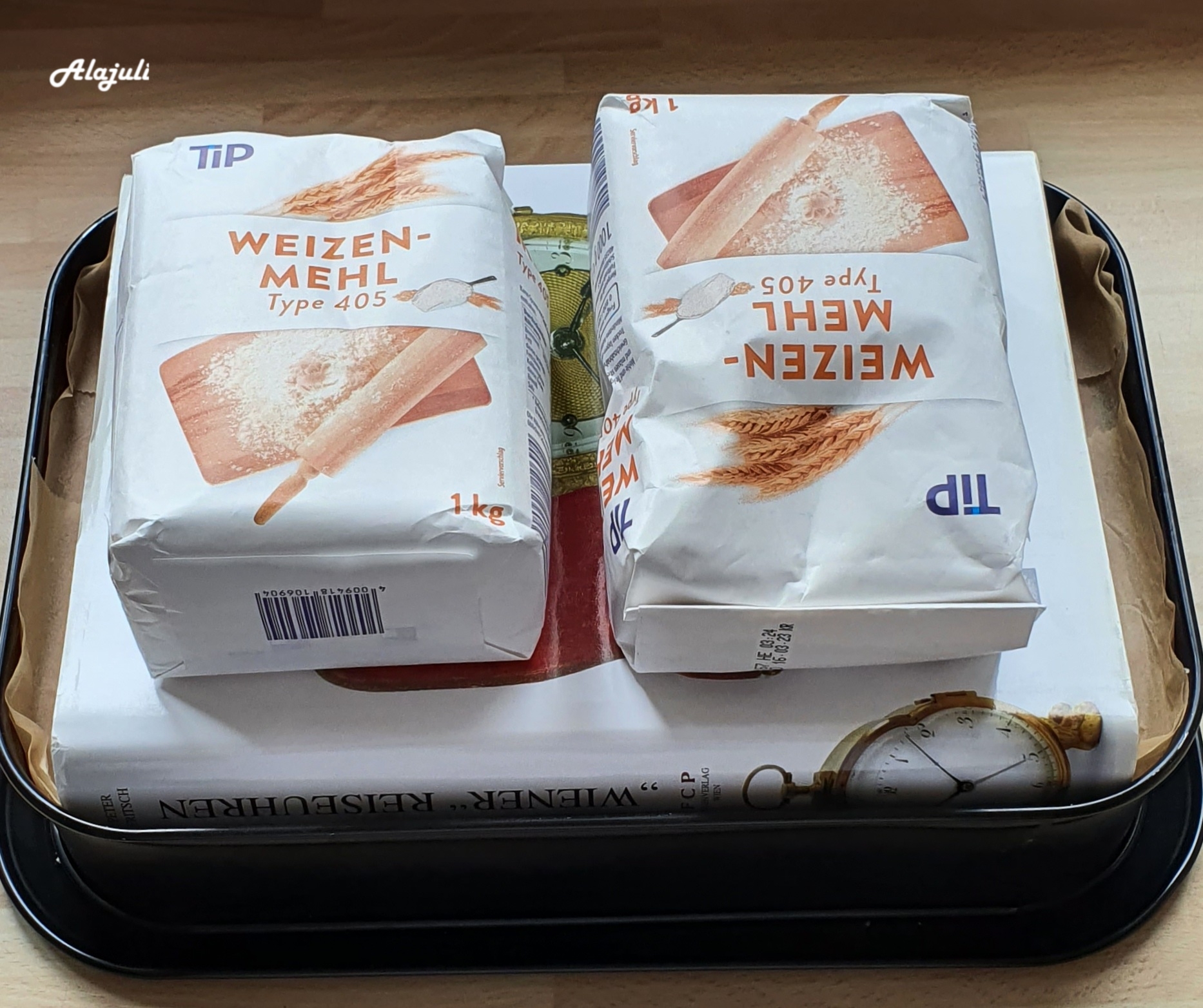 A sütire nehezéket teszünk. Én először letakartam a süti tetejét egy sütőpapírral. Egy, a tepsi méretével megegyező nagyságú könyvet tettem a tetejére és rá raktam 2 csomag lisztet.