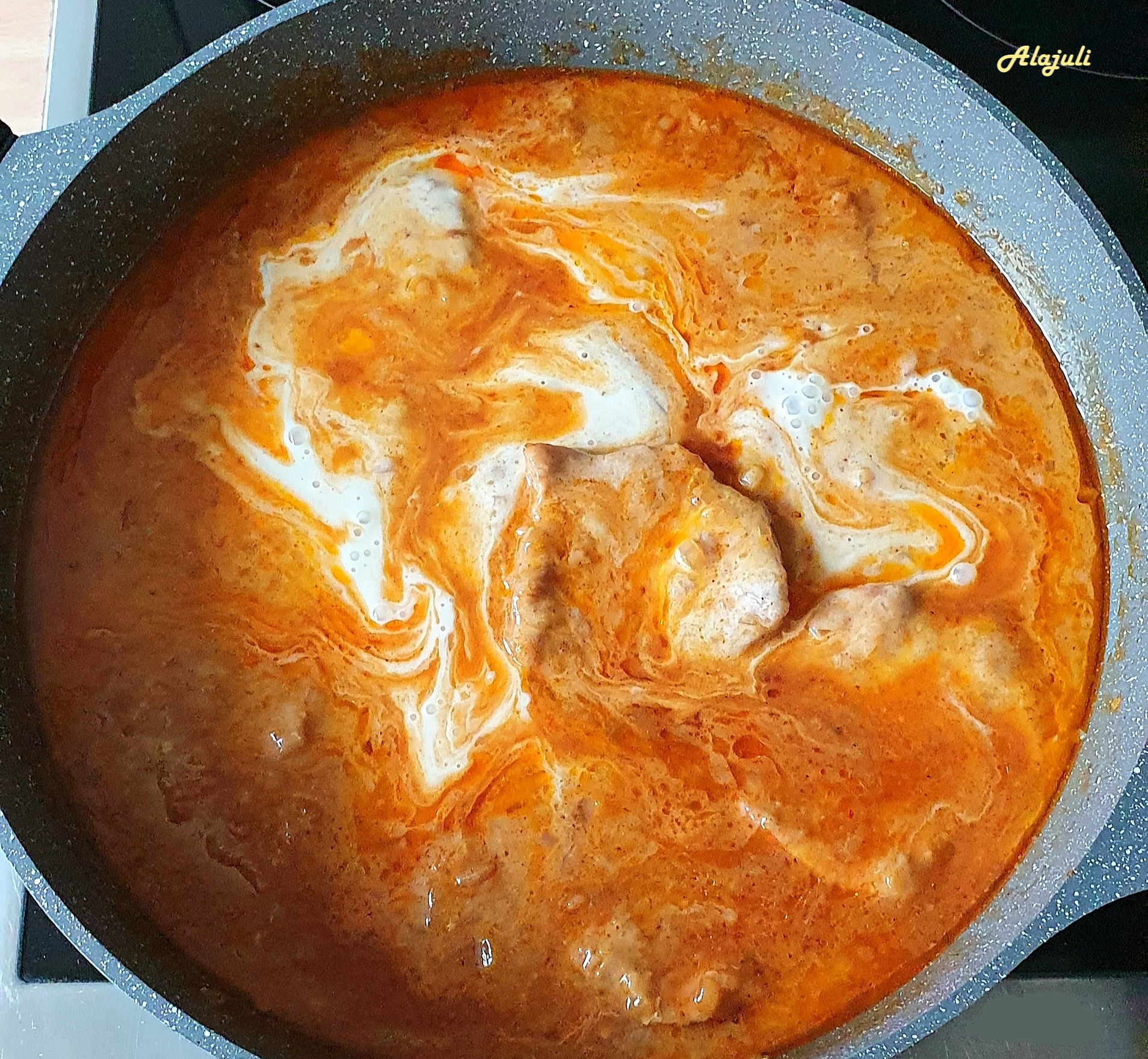 Szerencsére nagyon jól sikerült az improvizálás, úgyhogy egy igazán ízletes, kissé pikáns, mégis krémes mártást kaptam. Benne az omlós hús pedig vaj puhára főtt.