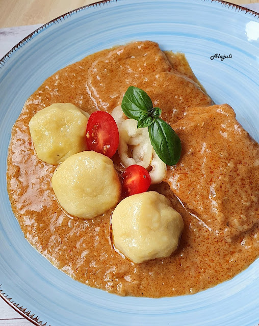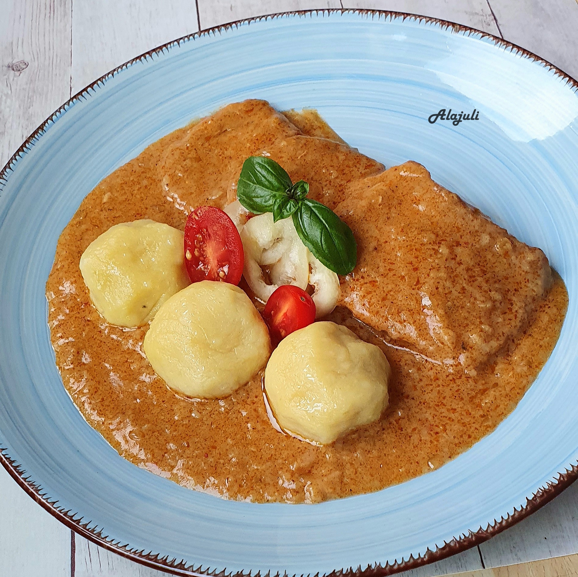 Én most burgonya gombócot készítettem hozzá a férjem kérésére, de bármilyen tetszőleges körettel tálalhatjuk.