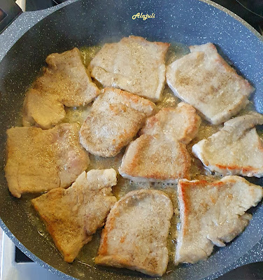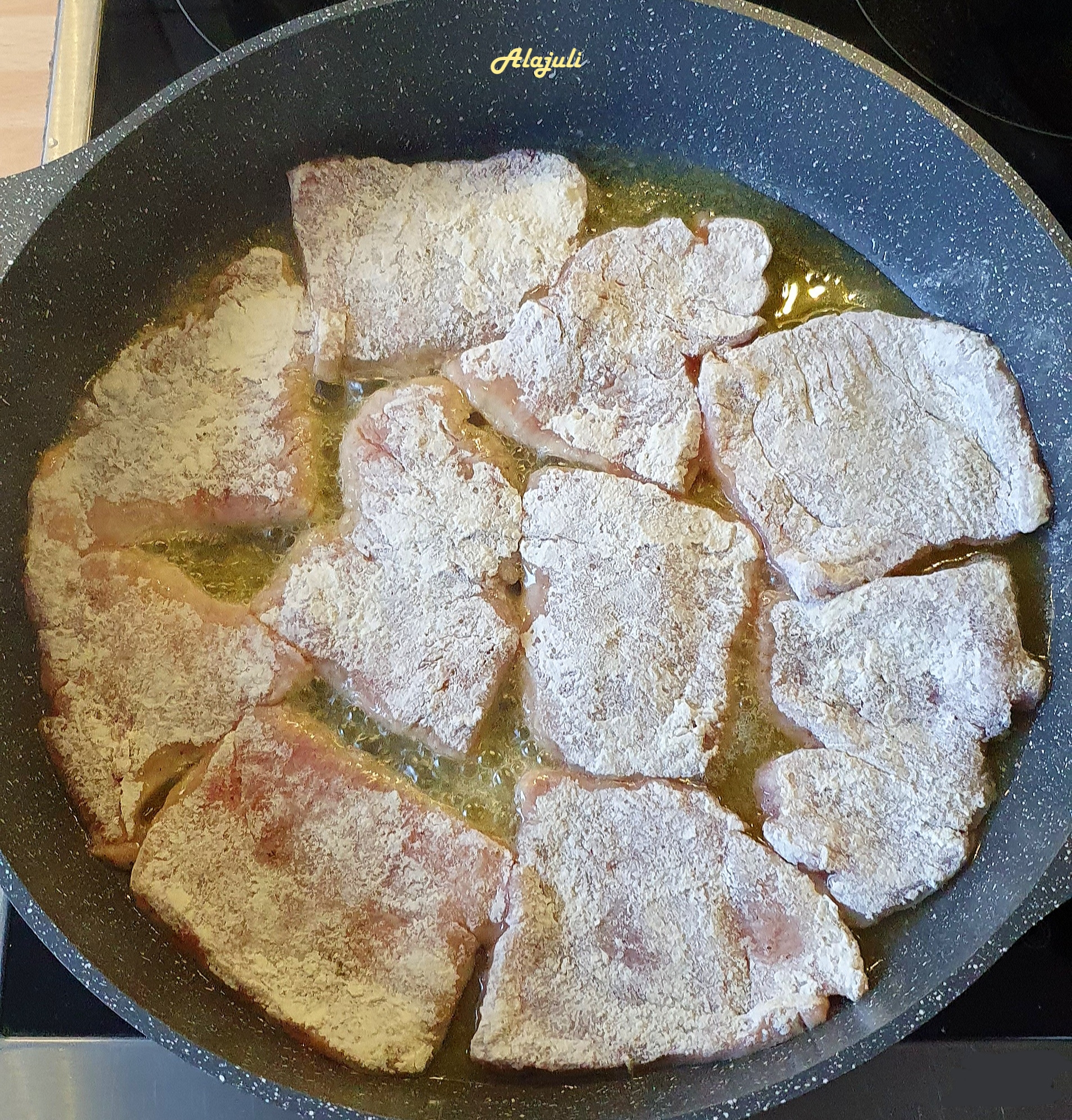 A húst felszeleteljük, ízlés szerint sózzuk, borsozzuk és megforgatjuk lisztben.
